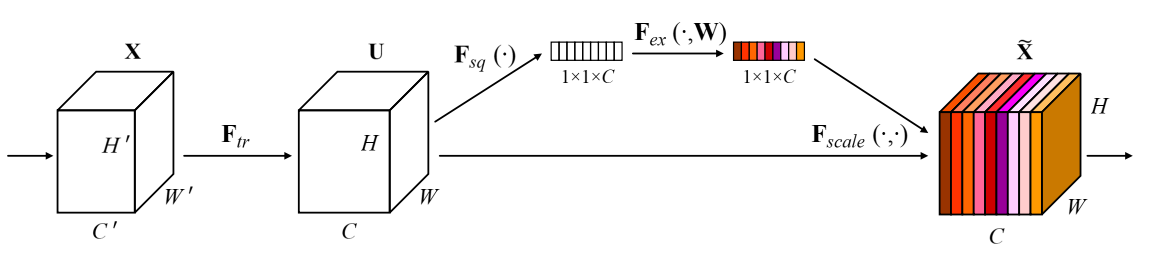 따라서 최종 출력은 \(\tilde{x_c} = F_{scale}(u_c, s_c) = s_c u_c\) \(\tilde{X} = [\tilde{x_1}, \tilde{x_2}, ... , \tilde{x_C}]\) 이고 \(F_{scale}(u_c, s_c)\)은 channel-wise multiplication을 의미합니다.