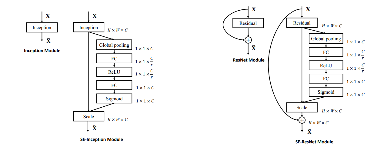 SE-Inception and SE-ResNet의 구조는 다음과 같습니다.