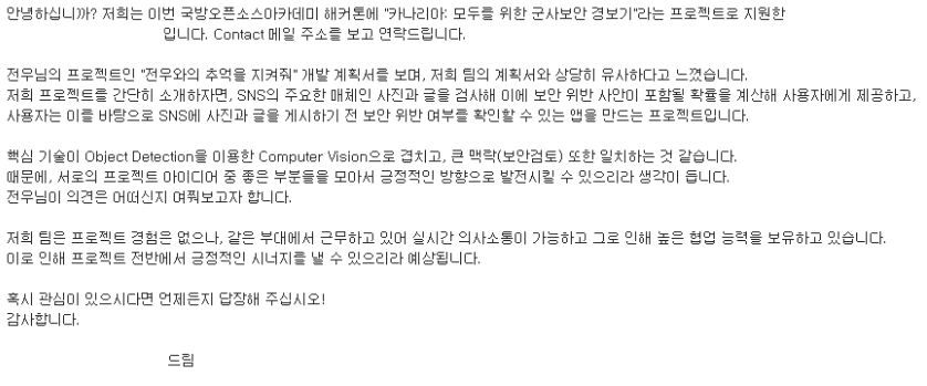 다른 사람이 만든거지만 이런 느낌이랄까? 그렇게 개발계획서를 작성하고 팀을 모집하다가 메일이 하나 왔다.