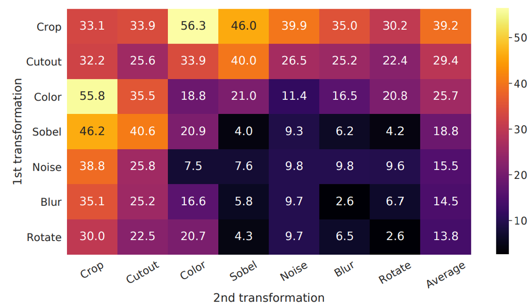 위의 그림은 SimCLR의 data augmentation으로 data augmentation의 조합에도 성능이 많이 달라진다.