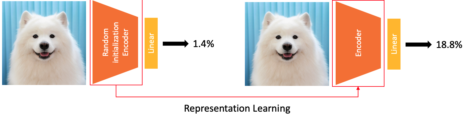 Encoder를 random initialization한 후 parameter를 고정한다. 그리고 linear layer를 하나 붙여 ImageNet에 학습을 시킬 경우 정확도가 1.8%로 낮았다. 하지만 random initialization encoder의 representation vector를 label로 만들어 encoder를 학습시킨 후 위와같은 학습을 하면 정확도가 18.8%로 상당히 상승했다. 저자는 이에 아이디어를 얻어 실험을 진행하였다.