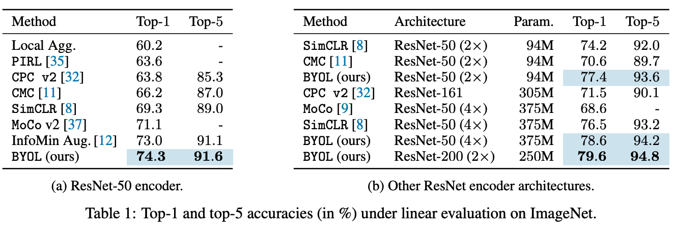 이 모든 과정을 model collapse를 방지하기 위해 하는 것이다. BYOL의 저자는 이를 해결하기위해 그저 encoder를 random initialization하여 실험을 진행했다.