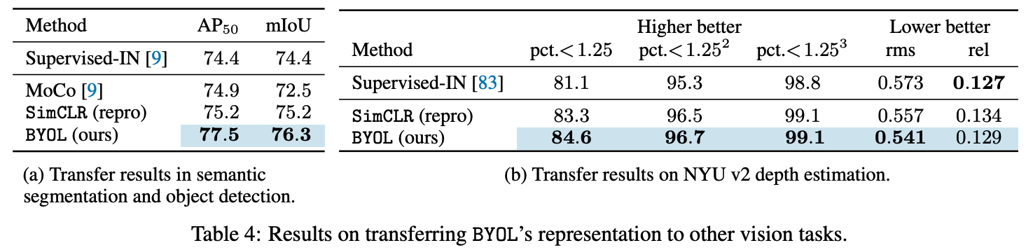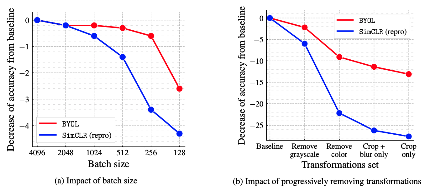 Batch size, data augmentation의 영향을 받으나 이는 SimCLR보다 더 적은 것으로 나타난다. BYOL은 positive sample만 사용하기 때문에 batch size에 둔감하다는 것이라 추정한다.