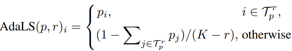 \[\mathcal{L}_{kd}(f_t;\mathcal{X}_t,f_s)=\mathbb{E}_{x_t\in \mathcal{X}_t} \mathcal{D}_{kl}(f_s(x_t)||f_t(x_t))\]source domain model의 예측값과 target domain model의 kl divergence가 최소가 되도록 학습을 진행한다. 하지만 저자는 source domain과 target domain의 차이로인해 noise가 발생할 것이라고 했고 이를 보정하기 위해 Adaptive Label Smoothing(AdaLS)을 제안한다.