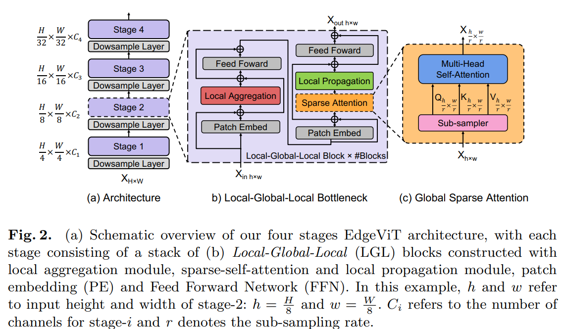 기존 PVTs나 Twins-SVTs는 key와 value만 subsampling하고 query는 모든 위치에서 계산한다. 반면 EdgeViT는 query, key, value 모두 delegate token에서만 계산하므로 연산량이 더 적다. Sub-sampling rate는 stage별로 다르게 설정한다: \((r_1, r_2, r_3, r_4) = (4, 2, 2, 1)\). 마지막 stage에서는 \(r = 1\)이므로 standard MHSA와 동일하다.