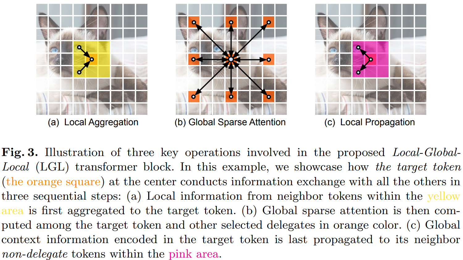 이제 attention에 대한 scope을 줄였으니 long-range relationship을 계산해야 한다. 하지만 모든 토큰에 대해 self-attention을 수행하면 비용이 크다. 저자는 각 \(r \times r\) local window에서 하나의 delegate token을 선택하여, delegate token들 간에만 self-attention을 수행한다. 이때 \(r\)은 sub-sampling rate이다.