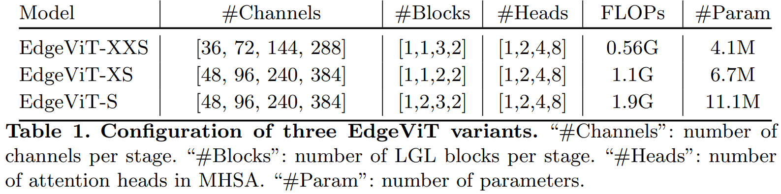 | EdgeViT-XXS | [36, 72, 144, 288] | [1,1,3,2] | [1,2,4,8] | 0.56G | 4.1M |
