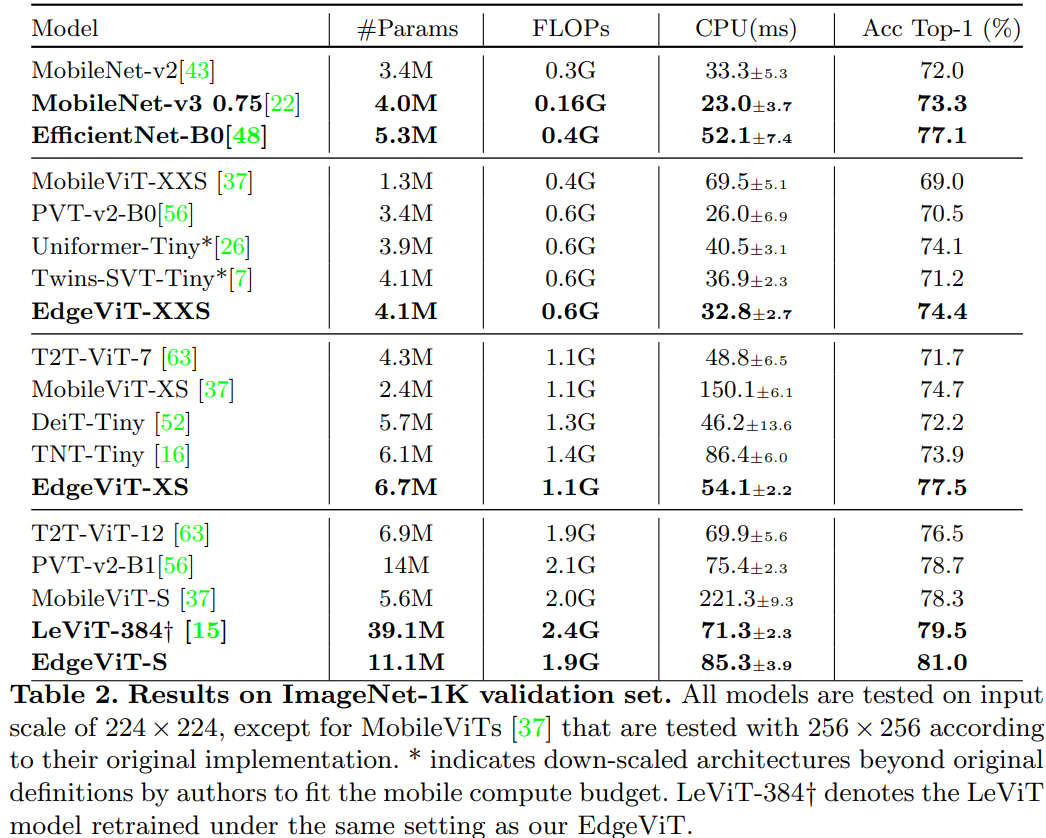 경량 ViT 모델들 중에서 EdgeViT는 accuracy-latency trade-off에서 좋은 성능을 보인다. 특히 DeiT-Ti, PVT-Tiny 등 기존 경량 ViT 대비 비슷한 정확도에서 latency가 낮다. 다만 MobileNetV2, EfficientNet-B0 같은 CNN 모델과 비교하면 latency에서는 아직 열세인데, 이는 ViT의 attention 연산이 모바일 하드웨어에서 아직 충분히 최적화되지 않았기 때문이다.