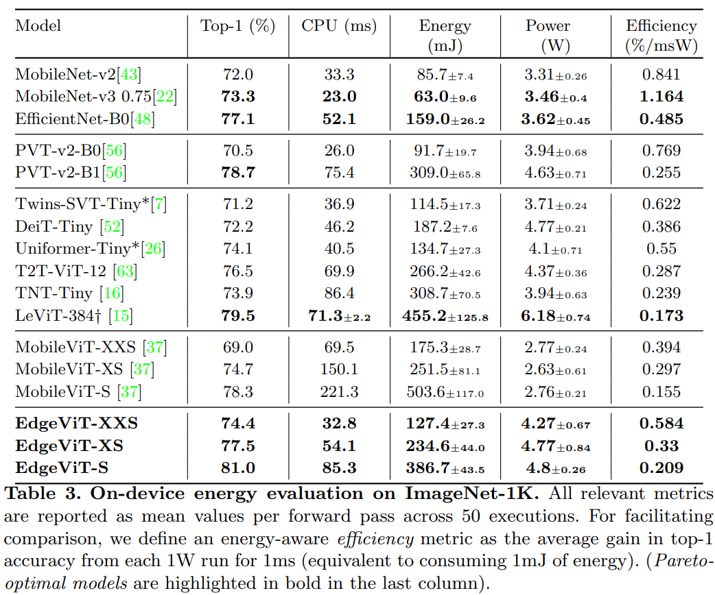 Energy efficiency 측면에서 EdgeViT는 특히 두드러진다. 정확도 대비 소비 전력을 측정하면 EdgeViT-S가 가장 효율적인 모델로 나타난다. 이는 Global Sparse Attention이 전체 토큰이 아닌 대표 토큰(delegate token)만 사용하여 연산량뿐 아니라 메모리 접근도 줄이기 때문이다. 배터리 기반 디바이스에서는 latency보다 에너지 효율이 더 중요한 경우가 많으므로, EdgeViT의 실용적 가치가 있다.