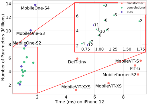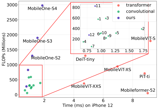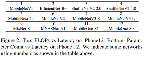 모델의 cost를 비교할 때 parameter의 수와 FLOPS를 기준으로 비교하곤한다. 하지만 실제 모바일환경에서 일치가 안될 경우고 있으므로 iPhone 12를 사용하여 상관관계를 측정했다.