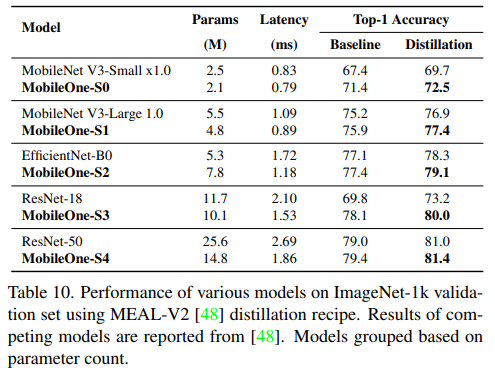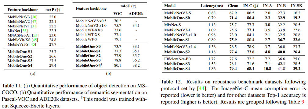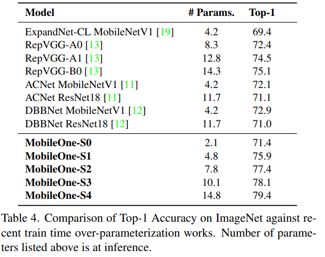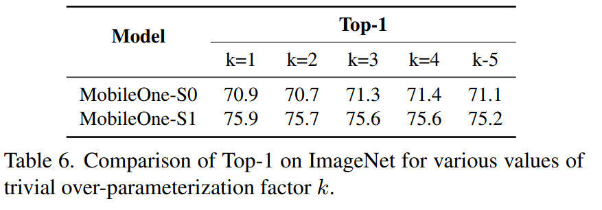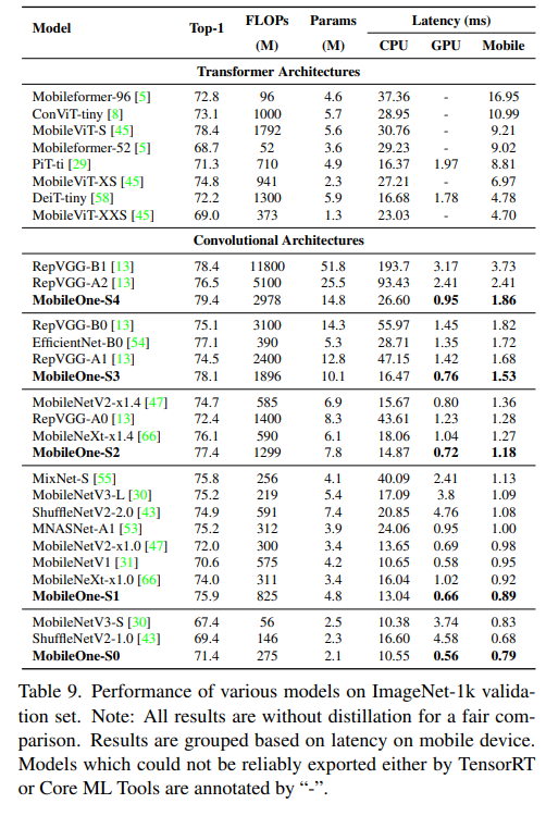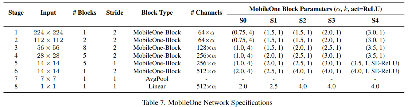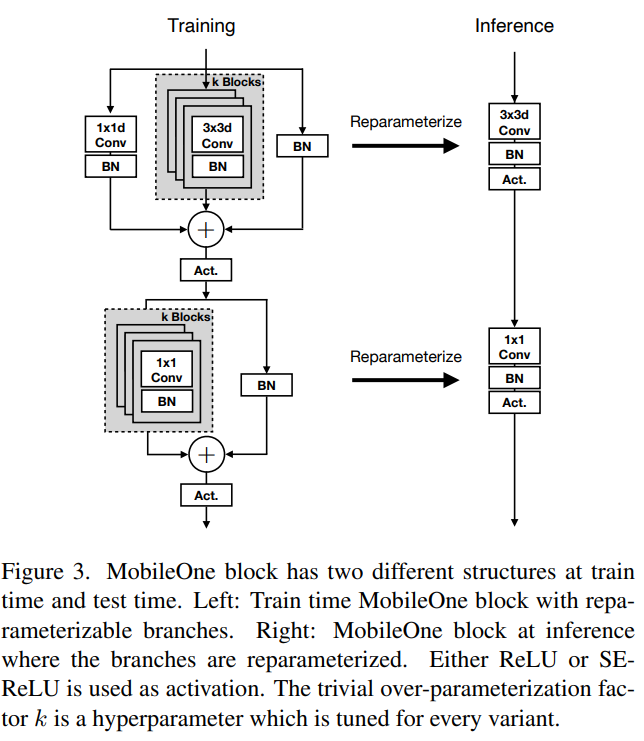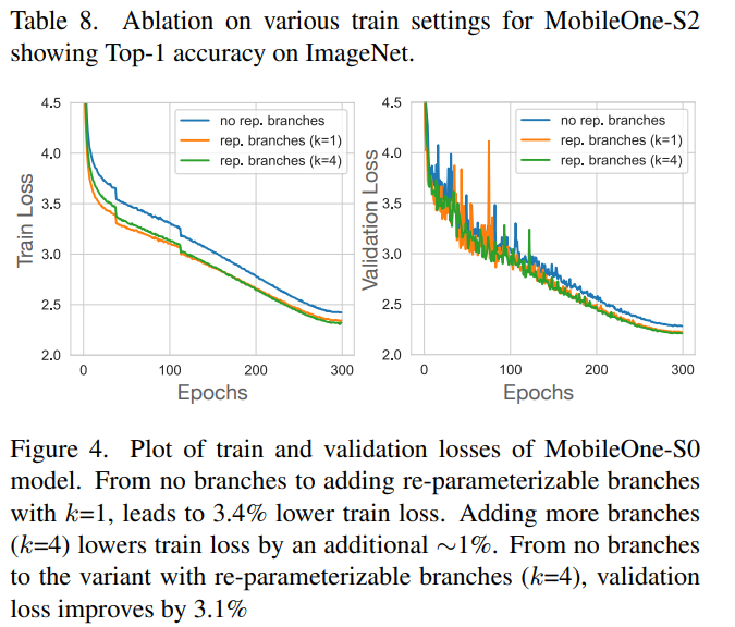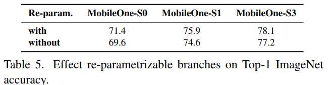 Runtime performance에 영향을 주는 원인은 크게 memory access cost과 degree of parallelism이 있다. 예를 들면 skip connection은 이전 feature map에 대한 정보를 저장하고 읽어와야하기 때문에 memory access cost가 늘어나고 SE-block에서 사용하는 global pooling operation은 동기화를 해야하기 때문에 degree of parallelism이 줄어든다. 따라서 MobileOne에서는 skip connection을 제거하고 SE-block의 수는 적당히 조절하였다.