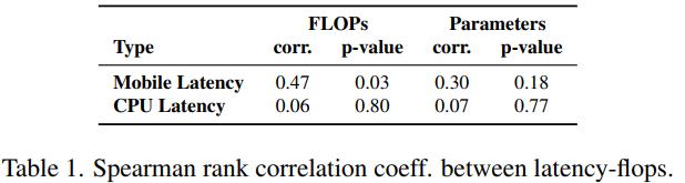 그 결과 모바일 환경에서는 FLOPS가 중간정도의 상관관계를 나타냈고 파라미터의 수는 낮은 상관관계를 나타냈다. 반면에 CPU 환경에서는 상관관계가 없어 보인다.