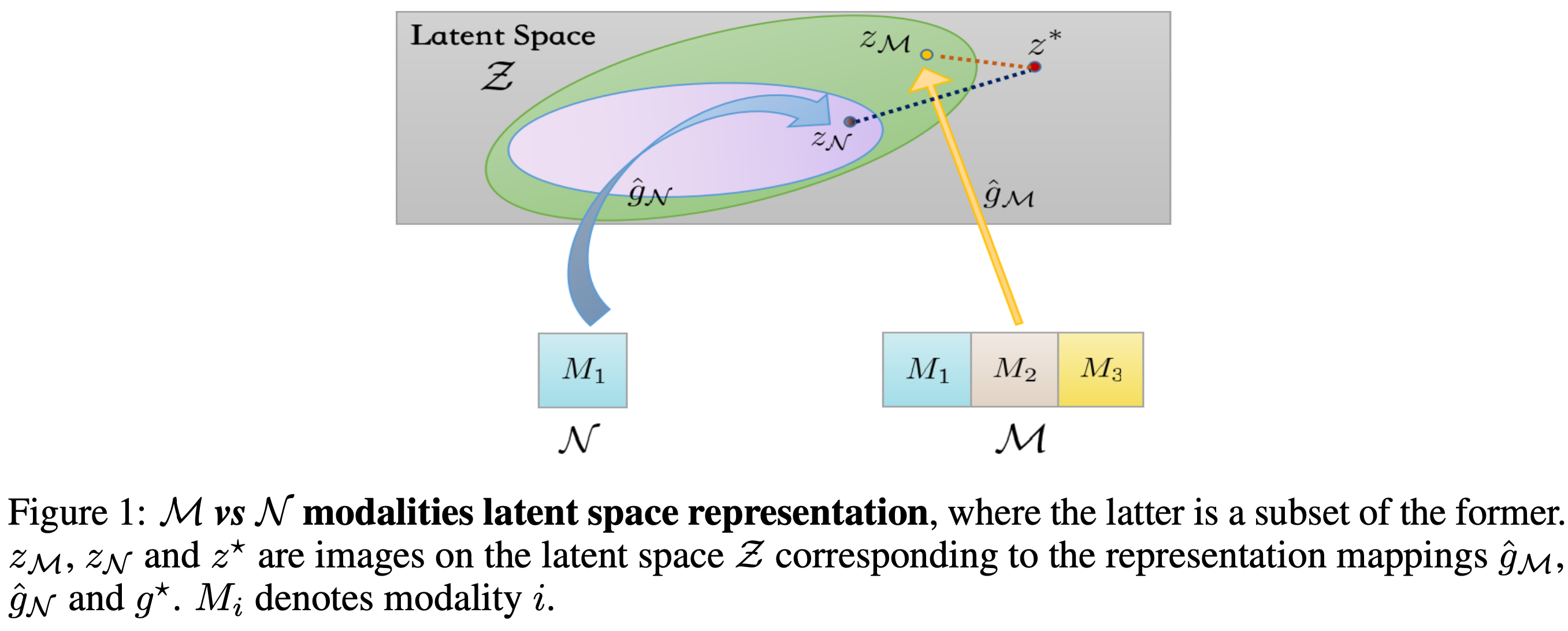 - Encoding: 여러 modality의 feature를 공통 latent space \(\mathcal{Z}\)로 매핑 — \(g^\star: \mathcal{X} \mapsto \mathcal{Z}\)