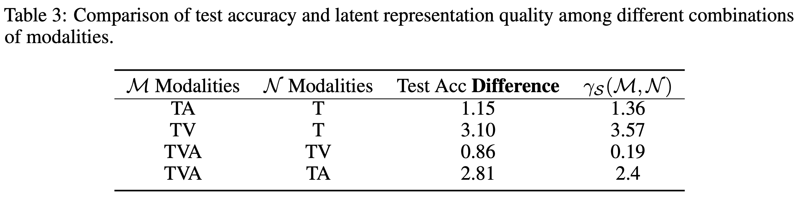 모든 경우에서 \(\gamma_S(\mathcal{M}, \mathcal{N}) > 0\)이다. 즉, 더 많은 modality를 사용할수록 latent representation quality가 더 좋고, 이것이 test accuracy 향상으로 이어진다. Test accuracy 차이와 \(\gamma_S\) 값이 같은 부호라는 것이 Theorem 1을 실험적으로 검증한다.