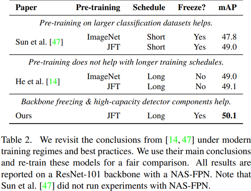 모든 실험서 공통적으로 classification pretrain시 이미지수가 비교적으로 적은 ImageNet보다 JFT-300M의 성능이 좋았다. 또한 FPN을 사용했을 때보다 parameter수가 더 많은 NAS-FPN, Cascade head를 사용했을 때 성능이 좋았다. 이는 backbone network가 다른 domain에서 학습이 되어 이를 generalize하는데 충분한 capacity가 필요하다고 한다.