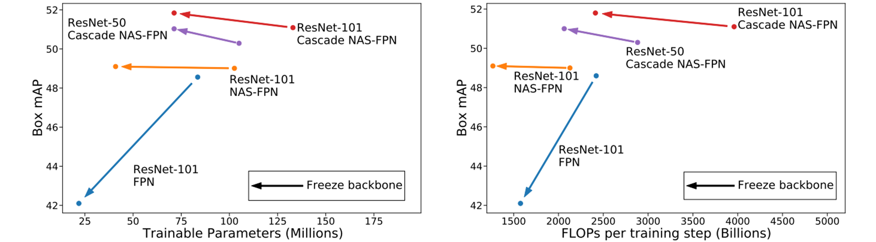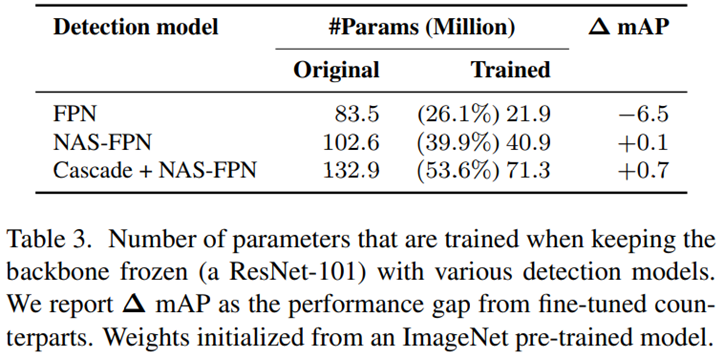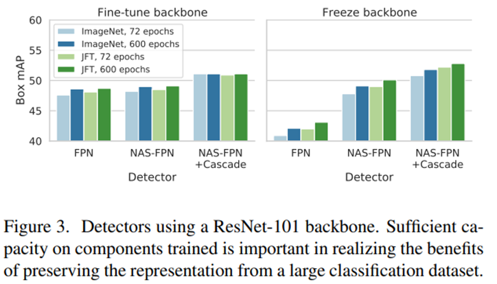 Backbone은 ImageNet에서 학습시켰다. 따라서 object detection과 domain gap이 발생하는데 이는 detector component가 해결할 수 있다. FPN을 사용할 경우 generalize하는데 capacity가 부족해 성능감소가 발생했다. 하지만 NAS-FPN과 Cascade head를 추가했을 때 성능에 이득이 있었다.