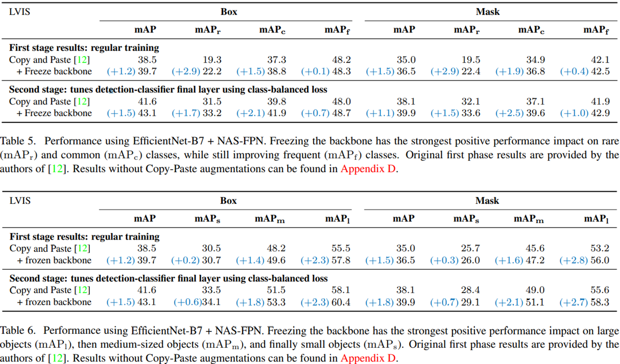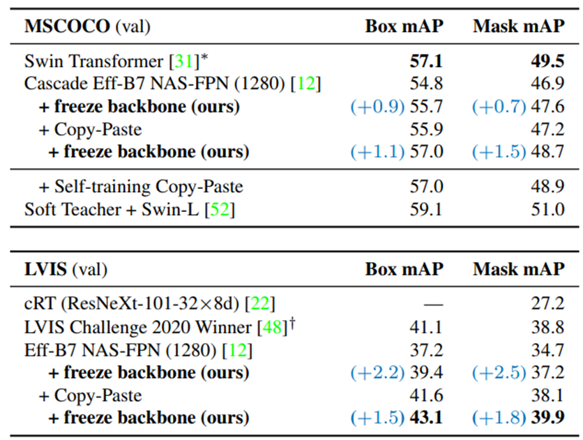 capacity가 충분한 detector component를 추가하고 backbone을 freeze시키는 것이 좋은 성능을 냈으며 Copy-Paste라는 강한 augmentation을 사용했을 때도 성능향상이 있었다.