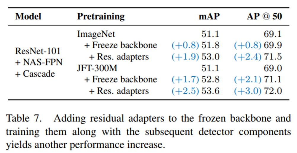 Backbone Freeze가 만병통치약은 아니었다. Freeze시킨 경우에서도 residual adapter를 사용하면 더 좋은 성능을 냈다.