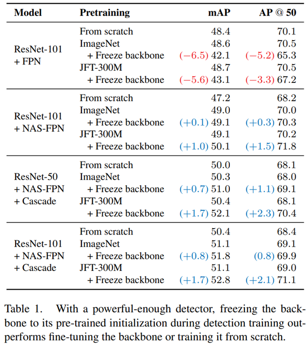 - 해당 요소들의 capacity가 충분하면 backbone freezing이 fine-tuning과 training scratch보다 좋은 성능을 보인다.