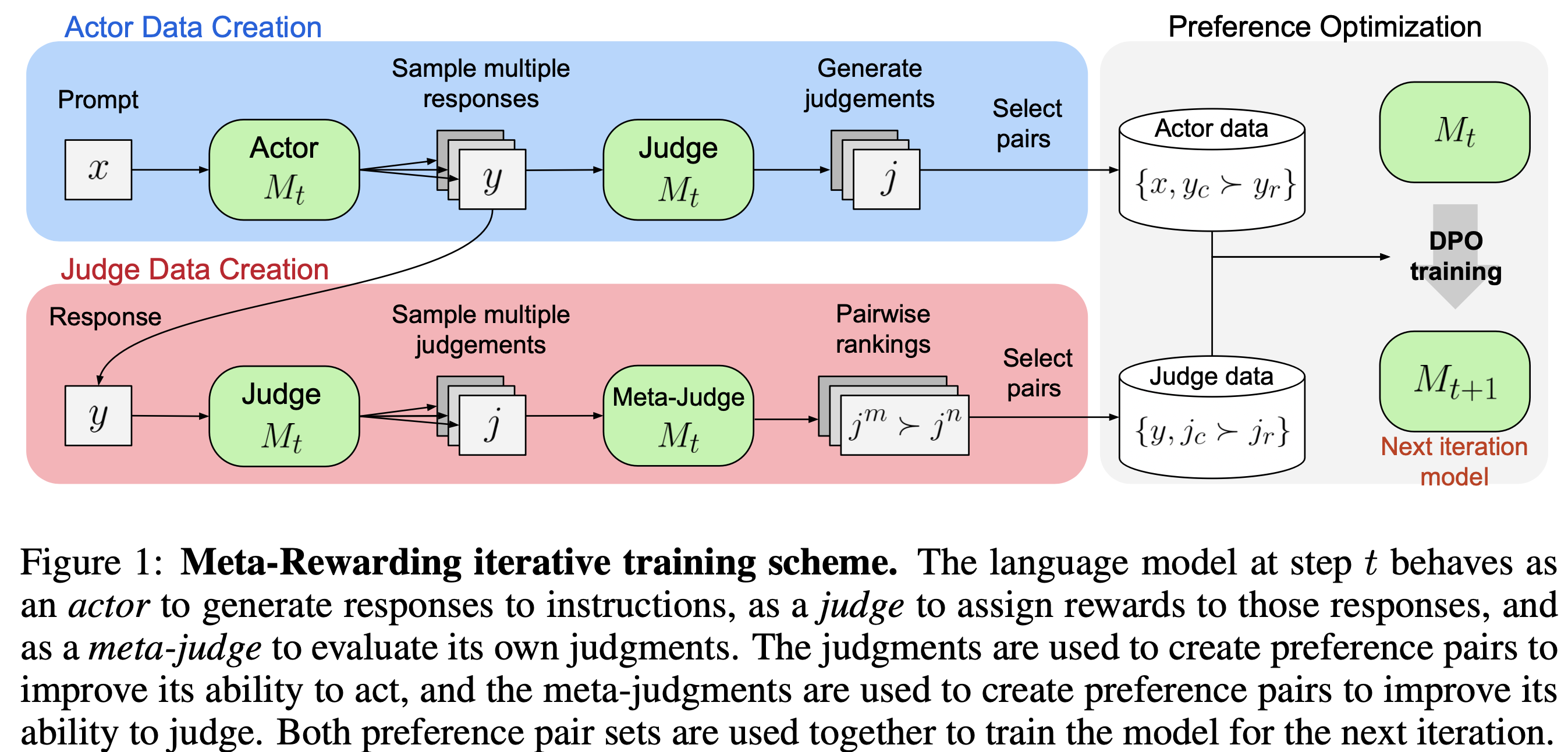 | Iter 1 | \(M_0\) → \(M_1\) | ✅ 포함 | SFT 모델에서 시작, DPO로 Actor+Judge 학습 |