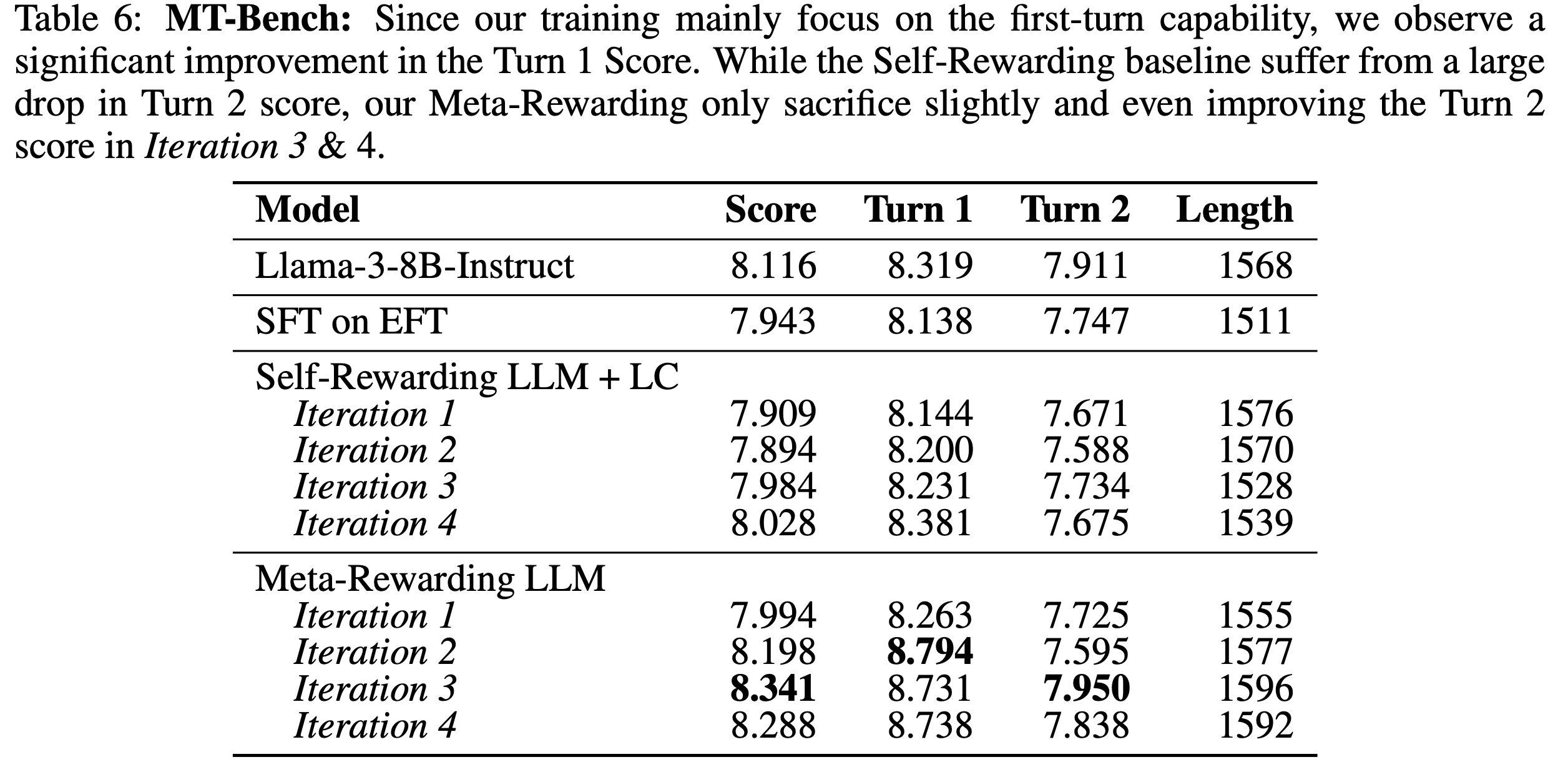 Meta-Rewarding은 single-turn 데이터만으로 학습했음에도, multi-turn 대화 성능이 유지되거나 오히려 개선된다. 이는 Judge 능력의 개선이 전반적인 언어 이해력 향상으로 이어지기 때문으로 추정된다.