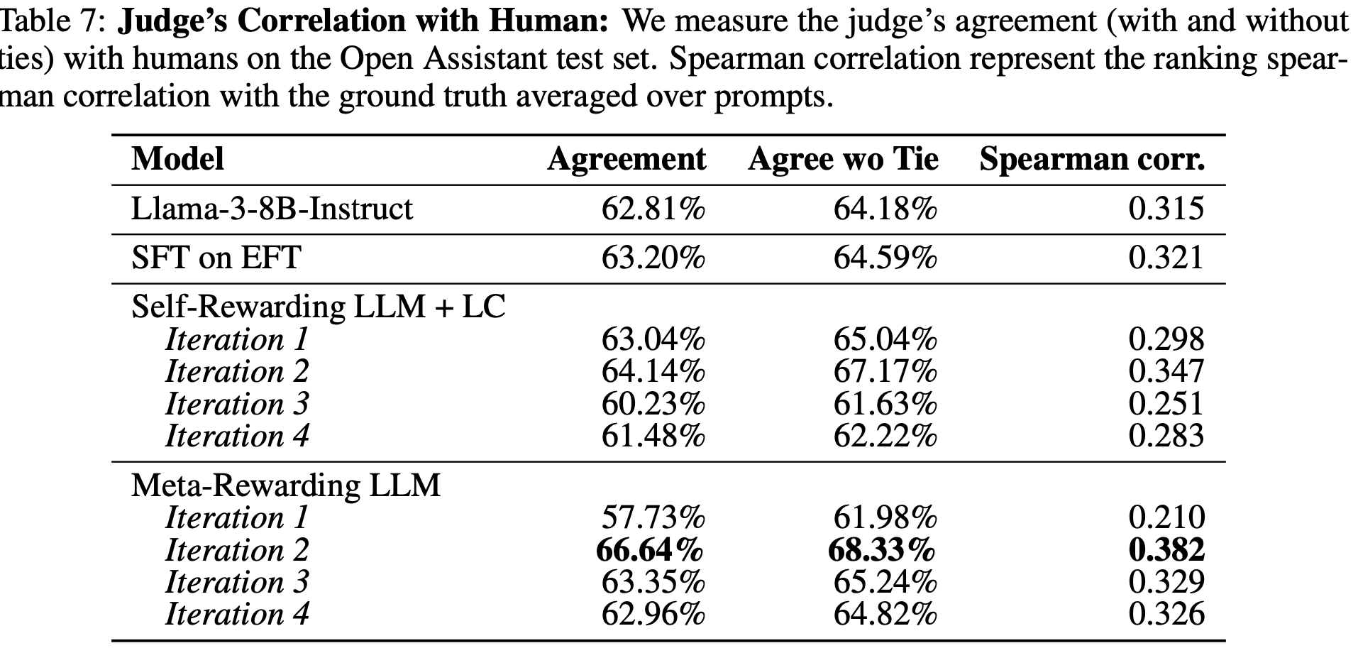 RewardBench에서 측정한 결과, Meta-Rewarding으로 학습한 모델은 GPT-4의 판단과의 상관관계가 향상된다. 이는 Judge preference pair가 실제로 Judge 능력을 개선시킨다는 직접적 증거이다.