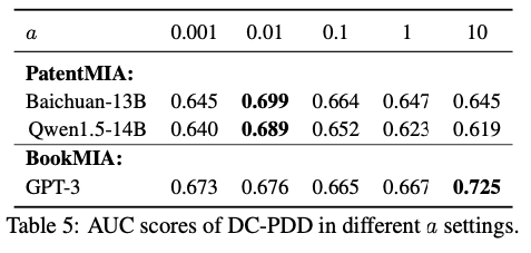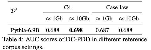 참조 코퍼스 \(\mathcal{D}'\)로 어떤 데이터를 사용하든 결과에 큰 차이가 없다. 이는 DC-PDD의 강점이다 — 모델의 학습 데이터와 정확히 같은 코퍼스가 없어도 일반적인 대규모 텍스트 코퍼스만 있으면 된다. 토큰의 “일반적인 빈도”만 추정하면 되기 때문에, 코퍼스의 도메인이 정확히 일치할 필요가 없다.