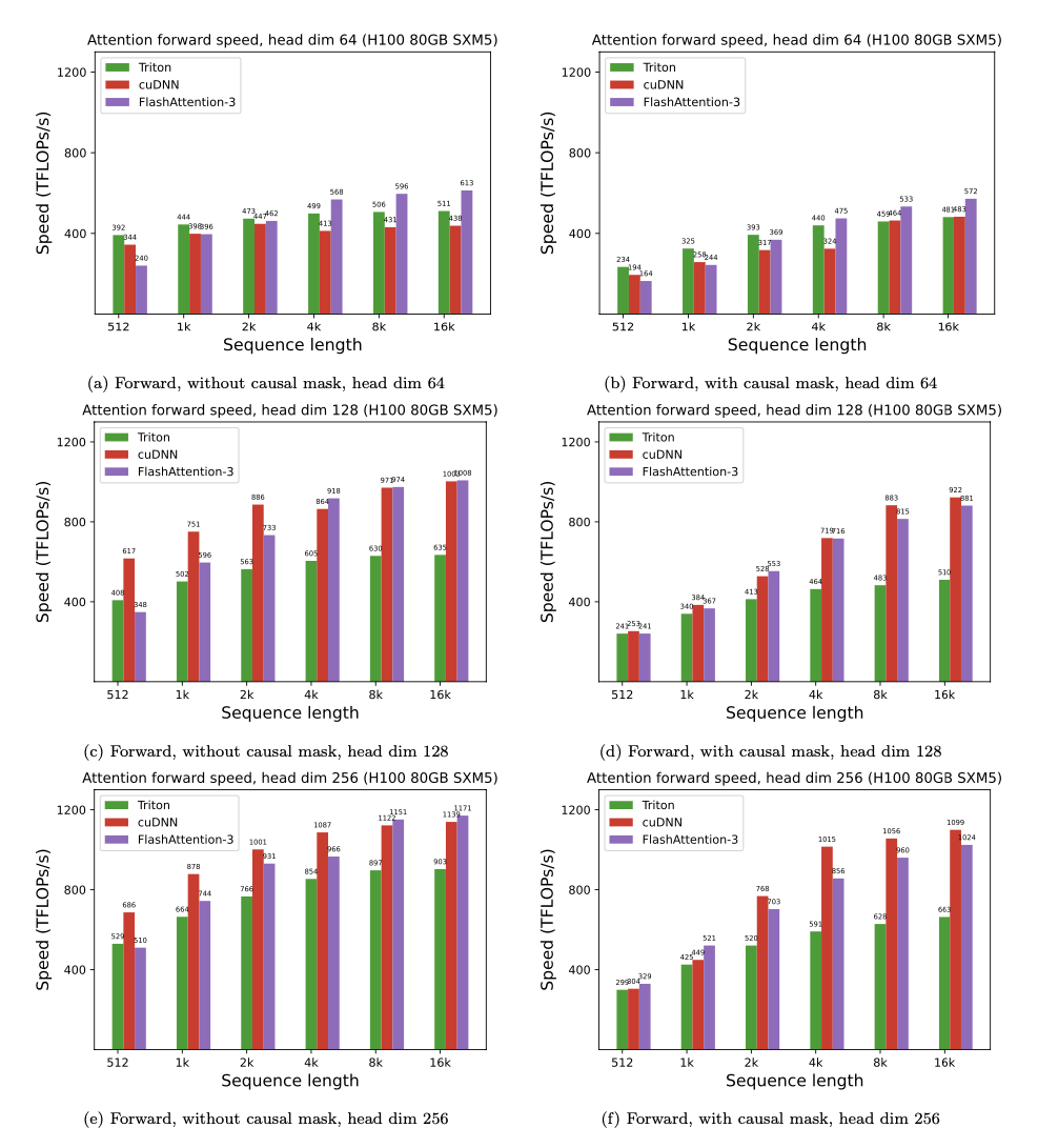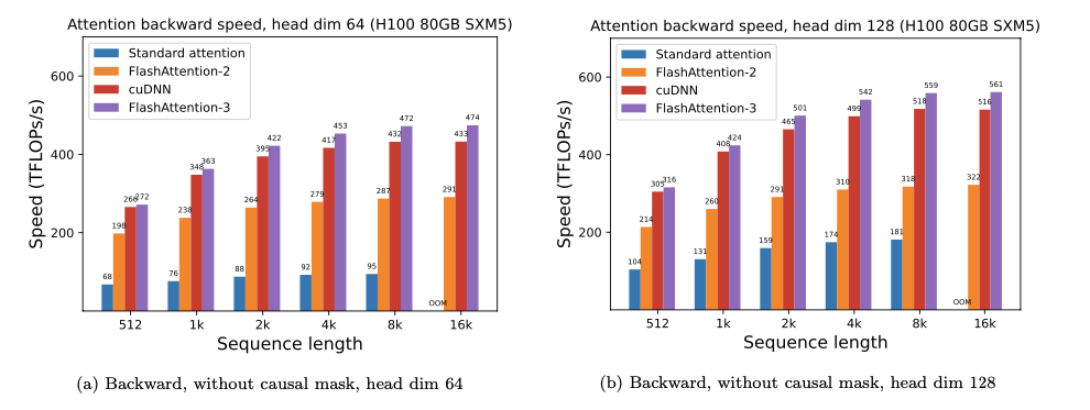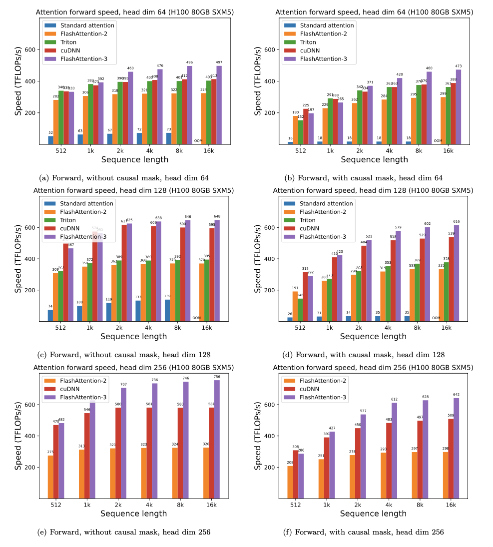 - Head dim 128: Non-causal, seqlen 8K 기준 — Standard 133, FA-2 370, cuDNN 610, FA-3 649 TFLOPS