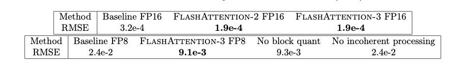 | FlashAttention-3 FP8 (block quant + incoherent) | 9.1e-3 |