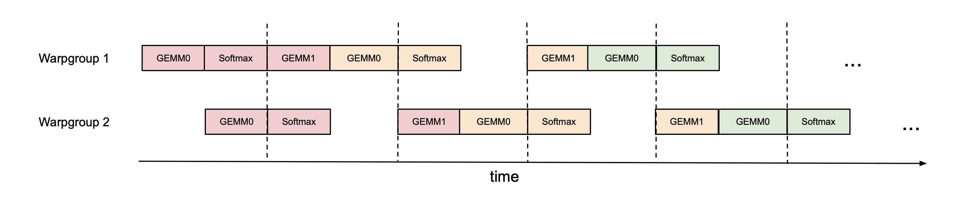 - Warpgroup 1의 GEMM1(\(PV\))과 다음 iteration의 GEMM0(\(QK^\top\))이 먼저 스케줄링된다.