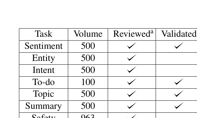 Table 1에서 Revieweda는 “사람이 직접 검토하고 수정하여 품질을 개선한 데이터”, Validatedb는 “(주로) 자동 생성된 데이터를 가볍게 검수한 데이터”를 의미한다. Sentiment, Entity, Intent, Topic, Summary는 모두 사람이 직접 검토한 고품질 데이터이고, Safety의 963건은 대량의 자동 생성 데이터를 검수한 형태다.