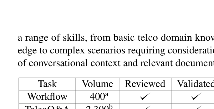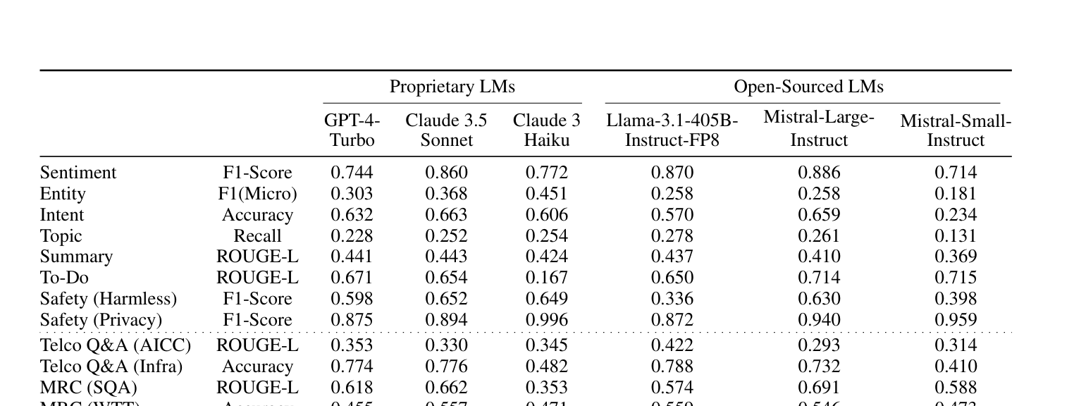 - TelTask Dataset: 통신 서비스 용어와 언어 능력을 평가한다. 고객 서비스 애플리케이션을 위한 핵심 통신 태스크를 식별하고 데이터셋 구축 방법론을 제시한다.