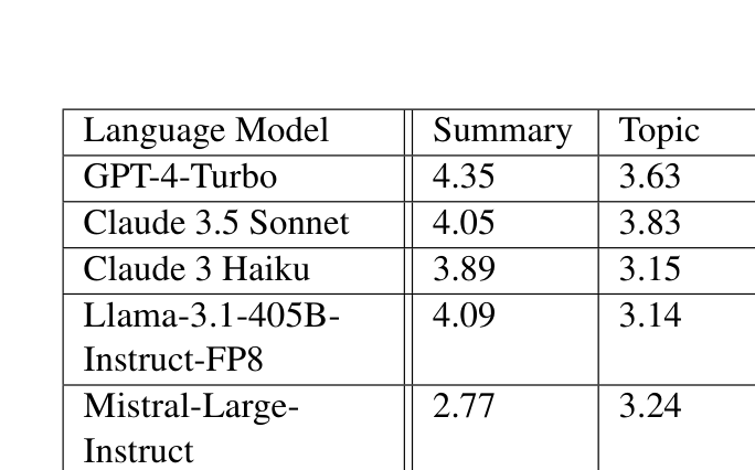 - LLM-as-a-Judge: GPT-4-Turbo(4.35) > Llama-3.1-405B(4.09) > Claude 3.5 Sonnet(4.05)