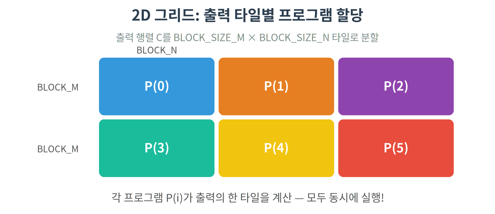 이전 튜토리얼은 1D 그리드(행 단위)였지만, MatMul은 2D 그리드를 사용합니다: