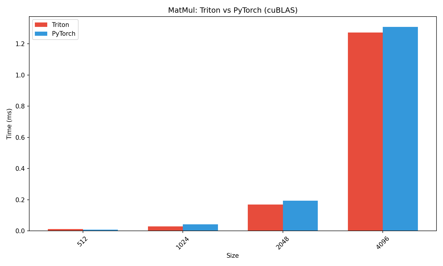 cuBLAS(torch.matmul)는 수십 년간 최적화된 라이브러리입니다. Triton으로 cuBLAS의 80~90% 성능에 도달하는 것이 목표입니다.