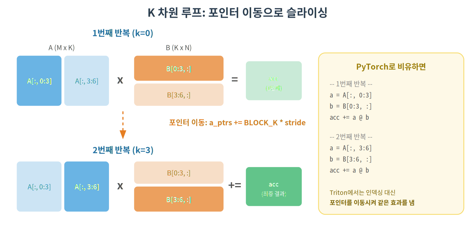 행렬 곱셈 C = A × B에서 A(M×K), B(K×N)일 때, K가 크면 한 번에 SRAM에 못 올립니다. 그래서 K를 BLOCK_SIZE_K씩 잘라서 반복하며, 부분 결과를 누적합니다.