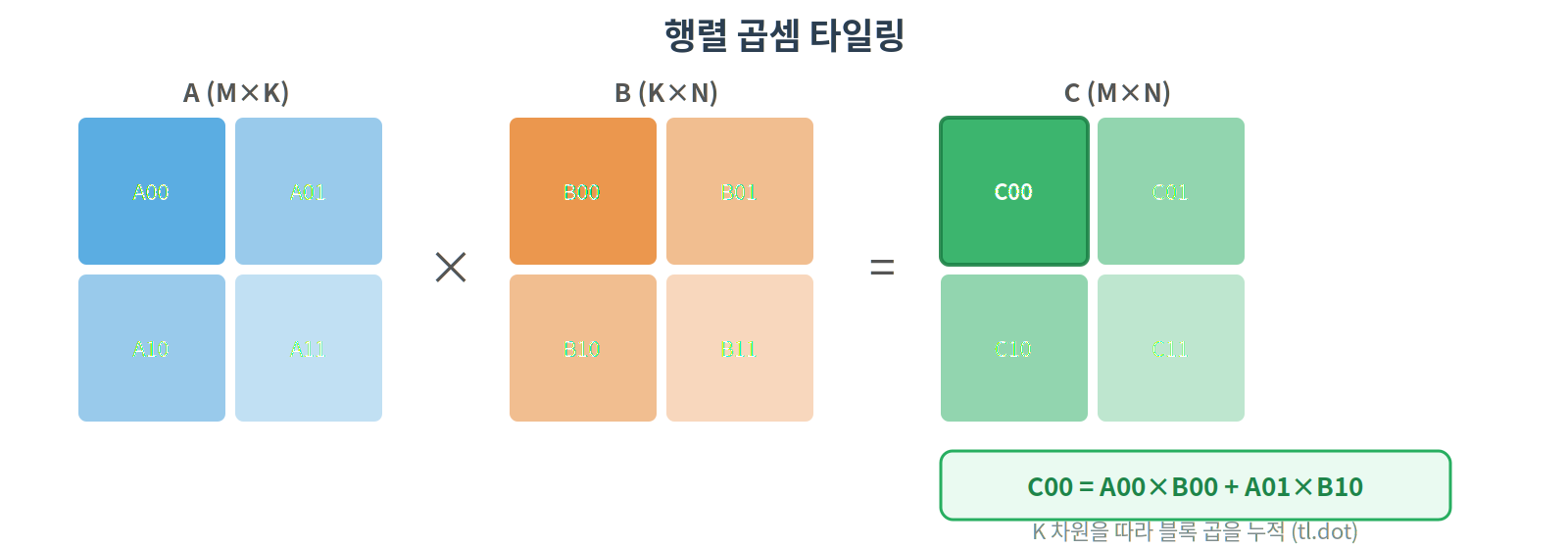 타일링: 행렬을 작은 블록으로 나누어 SRAM에 올리고, 블록 단위로 계산