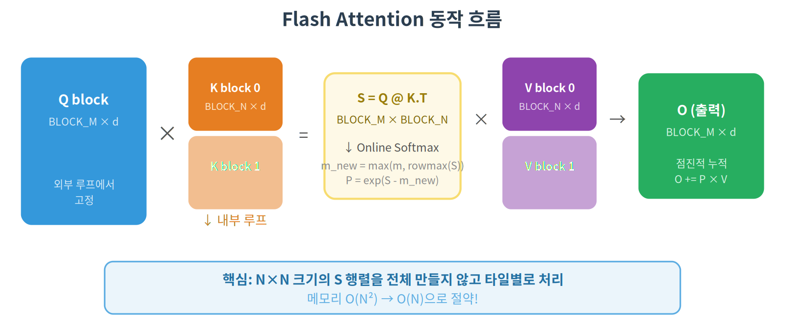타일 단위로 Q, K, V를 처리하면서 결과를 점진적으로 누적합니다. 이를 위해 Online Softmax 알고리즘이 필요합니다.
